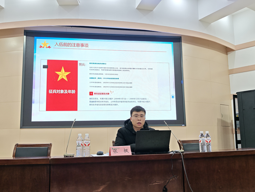 宣讲会上,张枫围绕征兵入伍条件、国防意义、优惠政策及基本流程四个核心方面展开详细讲解。在征兵入伍条件介绍环节,他重点明确了视力、体重、身高和年龄四项核心要求。随后深入阐述国防的重要意义,指出国防是国家的防务与综合性学问,直接彰显国家综合实力,帮助同学们树立“国无防不立”的认知。讲解过程中,张枫还主动与同学们互动,针对同学提出的疑问耐心解答,现场氛围热烈。优惠政策是本次宣讲会的重点,张枫逐一解读了大学生应征入伍“四个优先”、服义务兵役国家资助、退役后复学升学优惠及就业优先招录等政策,用具体红利打消同学们的后顾之忧。最后他明确了应征需遵循的政治初审、新兵预定和审批入伍原则,以及网上报名、初审初检等流程。