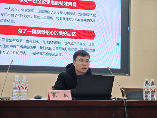 本网讯(通讯员 李艳飞)为帮助25级学生全面掌握征兵入伍相关知识,激发青年学子参军报国的热情,为学院后续征兵工作顺利开展筑牢基础,12月26日,我院于文化路校区三百人报告厅召开新生征兵入伍宣讲会。25级全体学生参会,本次活动由院团委副书记李艳飞主持,院团委辅导员张枫主讲。