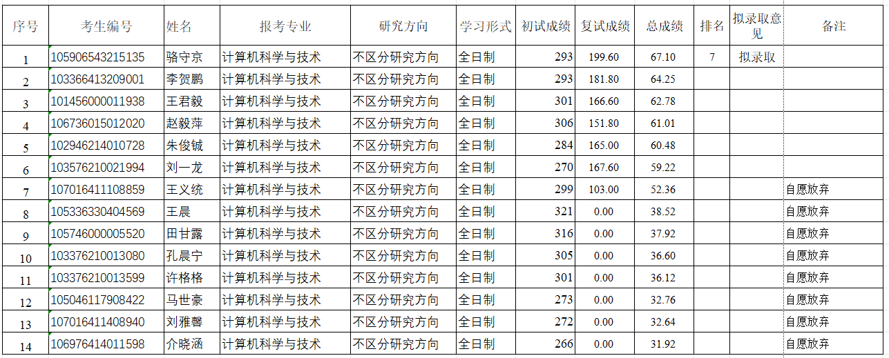 根据我院2026年硕士研究生招生复试第一次调剂考生复试情况和管理科学与工程专业第二次开通调剂系统情况,经我院研究生招生工作领导小组研究决定,计算机科学与技术专业拟增加1个招生计划数。按照计算机科学与技术专业调剂考生复试总成绩排名,顺次补录第七名考生: